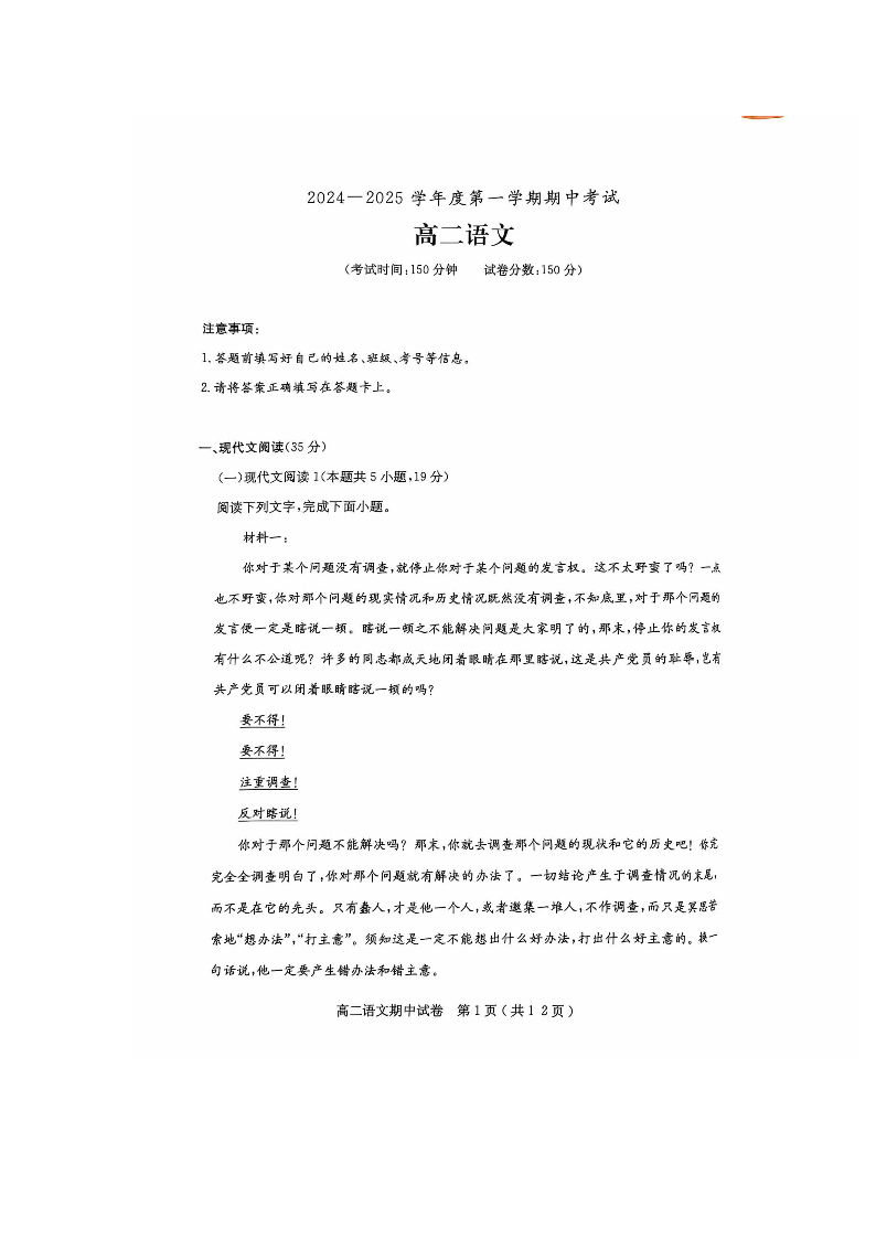 广东省茂名市电白区2024-2025学年度第一学期期中考试语文+答案