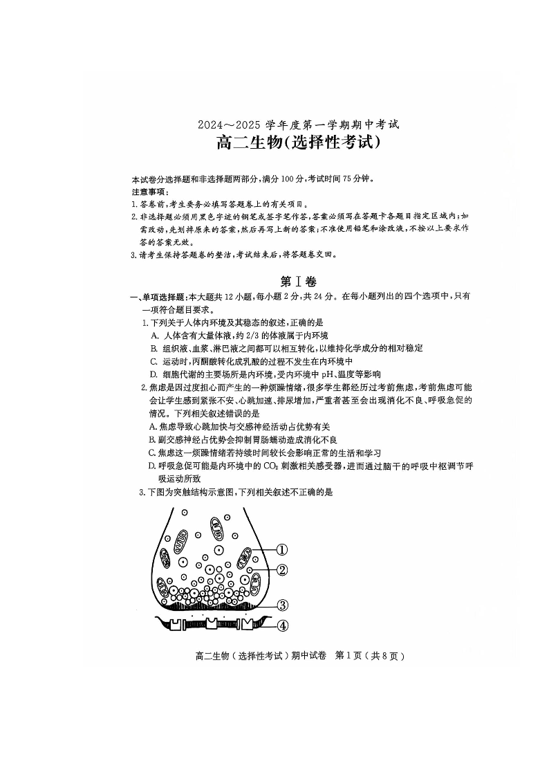 广东省茂名市电白区2024-2025学年度第一学期期中考试生物+答案