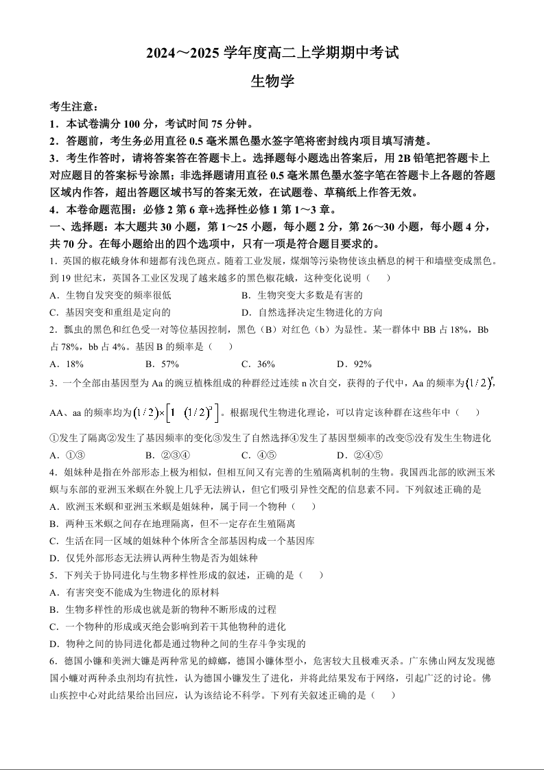 广东省深圳市部分学校2024-2025学年度高二上学期期中考试生物+答案