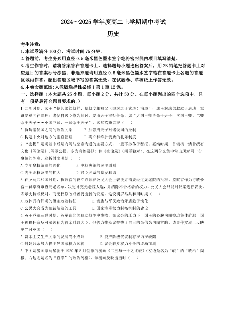 广东省深圳市部分学校2024-2025学年度高二上学期期中考试历史+答案