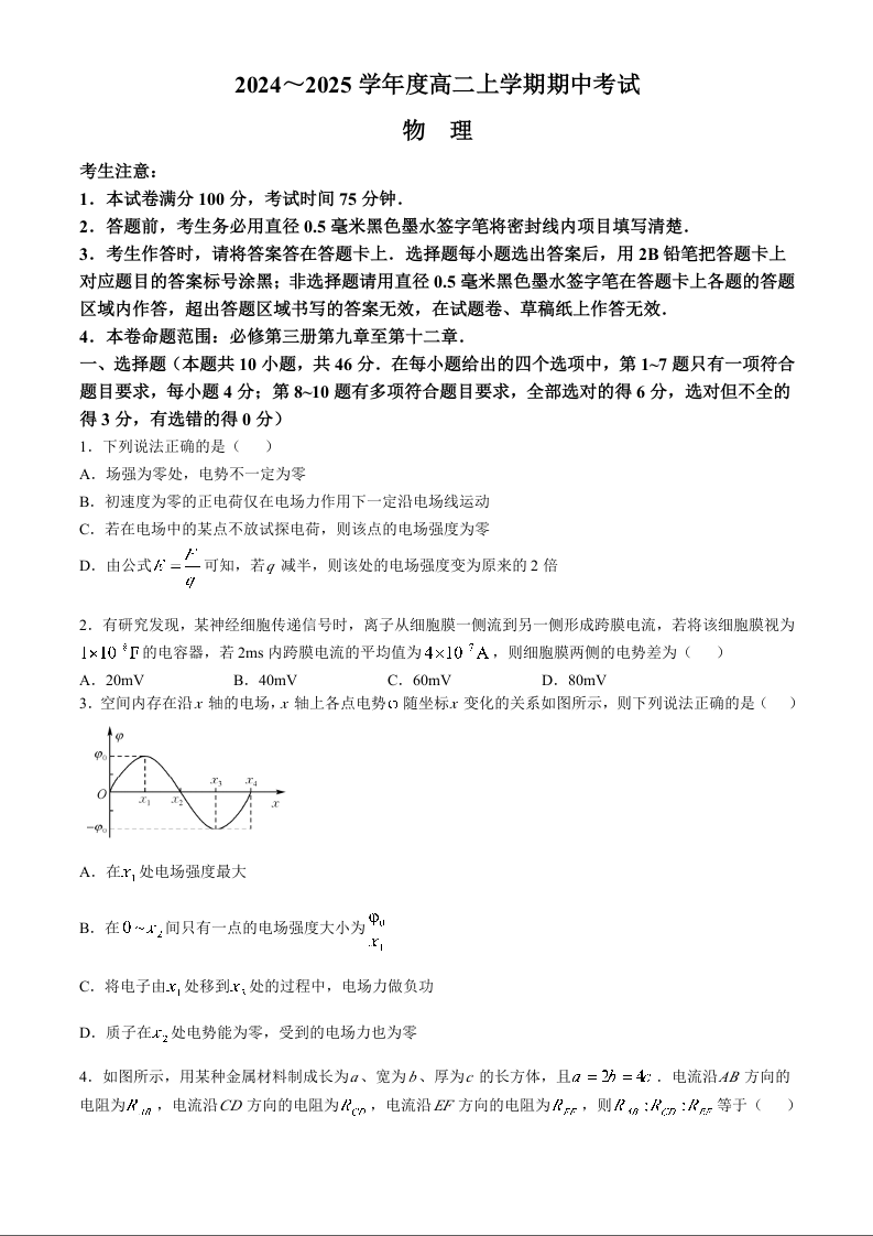 广东省深圳市部分学校2024-2025学年度高二上学期期中考试物理+答案