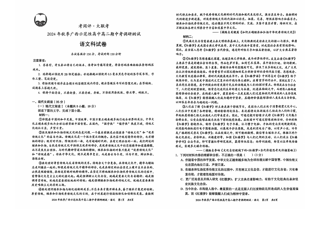 广西2024年秋季示范性高中高二期中考调研测试语文试卷