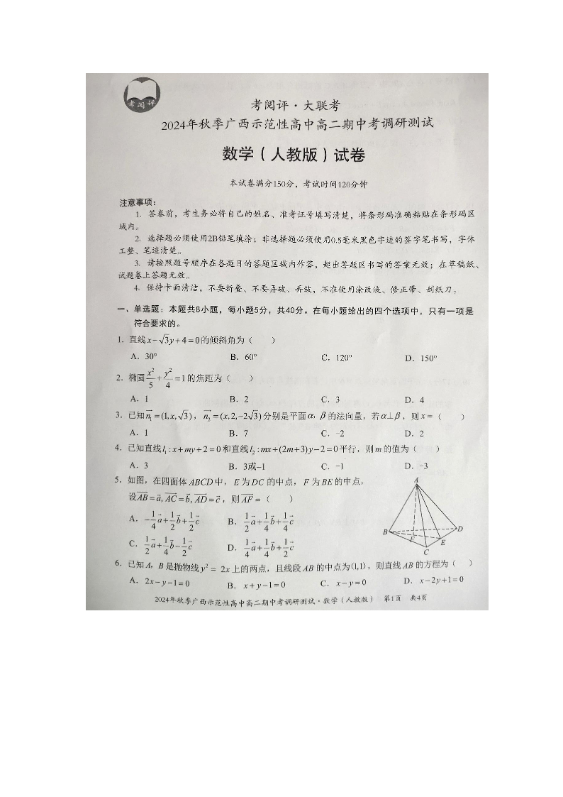 广西2024年秋季示范性高中高二期中考调研测试数学试卷