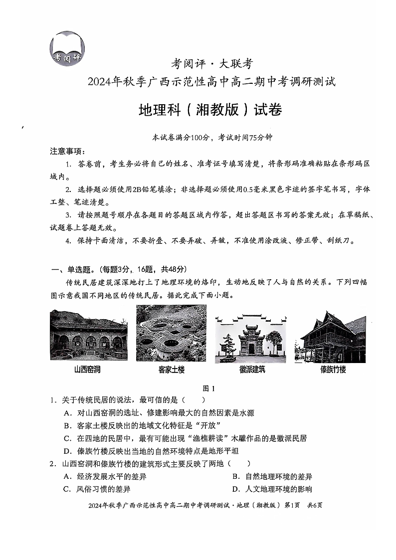 广西2024年秋季示范性高中高二期中考调研测试地理试卷