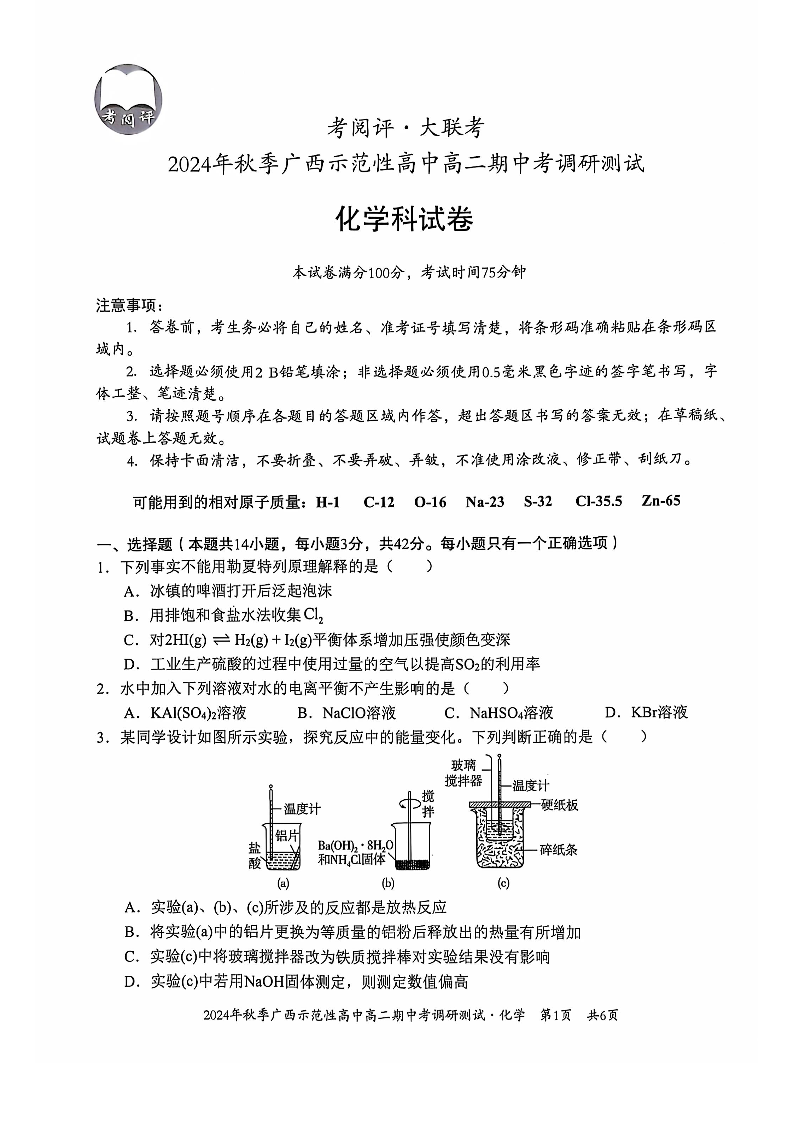 广西2024年秋季示范性高中高二期中考调研测试化学试卷