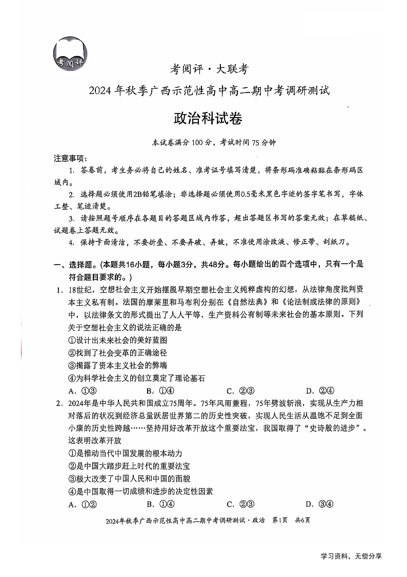 广西2024年秋季示范性高中高二期中考调研测试政治试卷