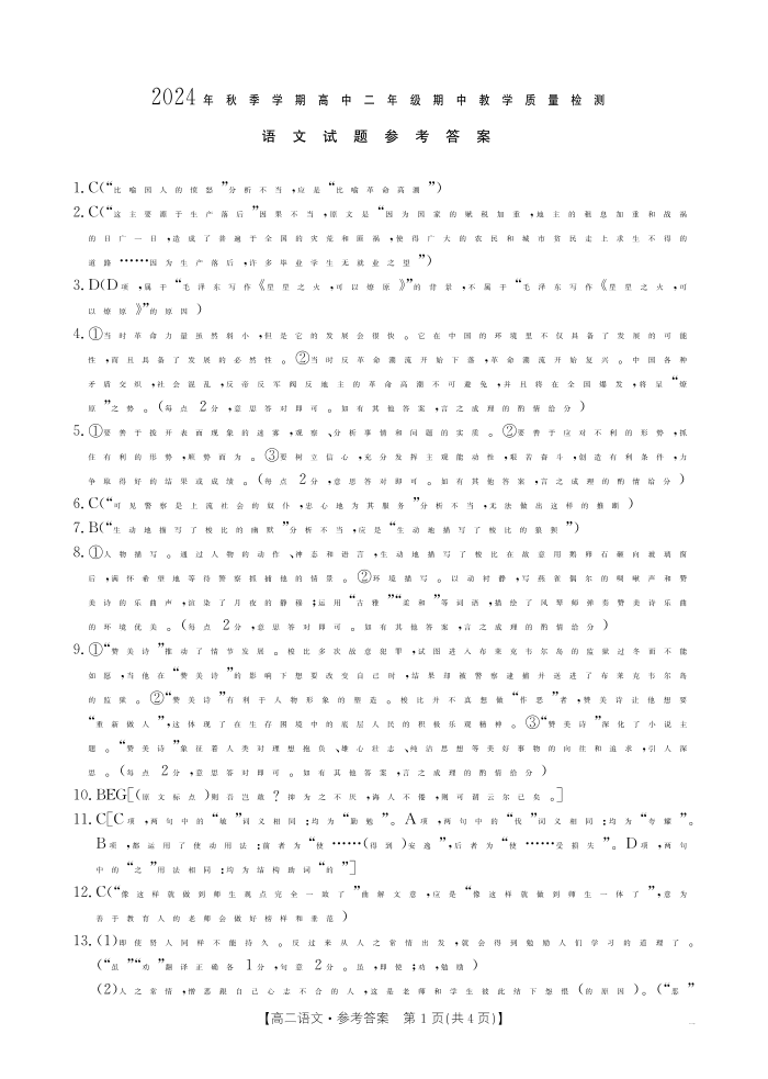 广西省梧州市2024年高二秋学期期中考试语文答案