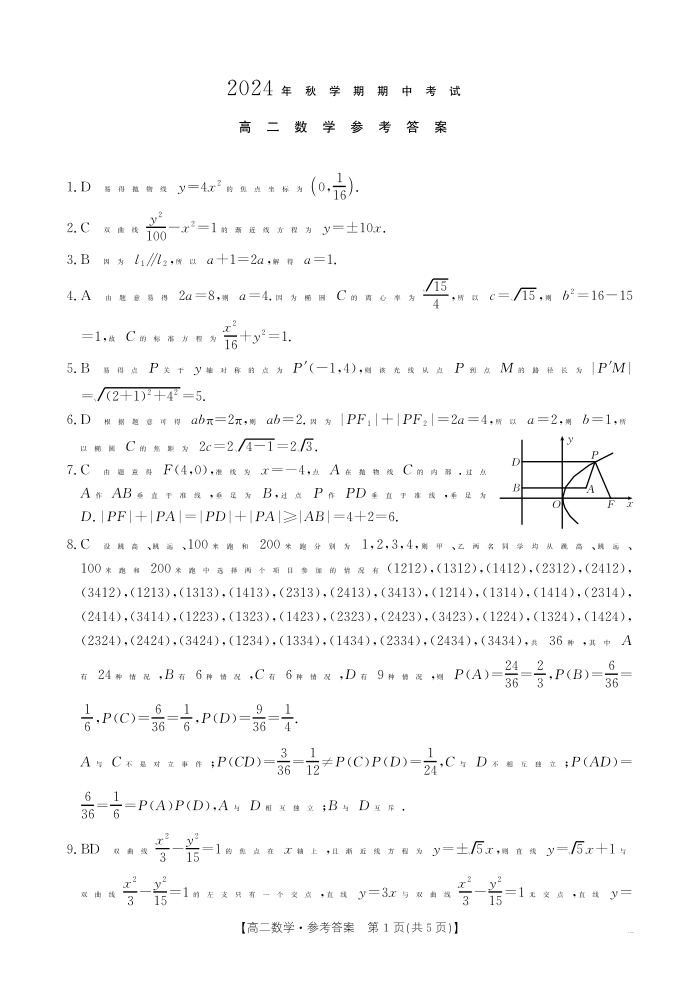 广西省梧州市2024年高二秋学期期中考试数学答案