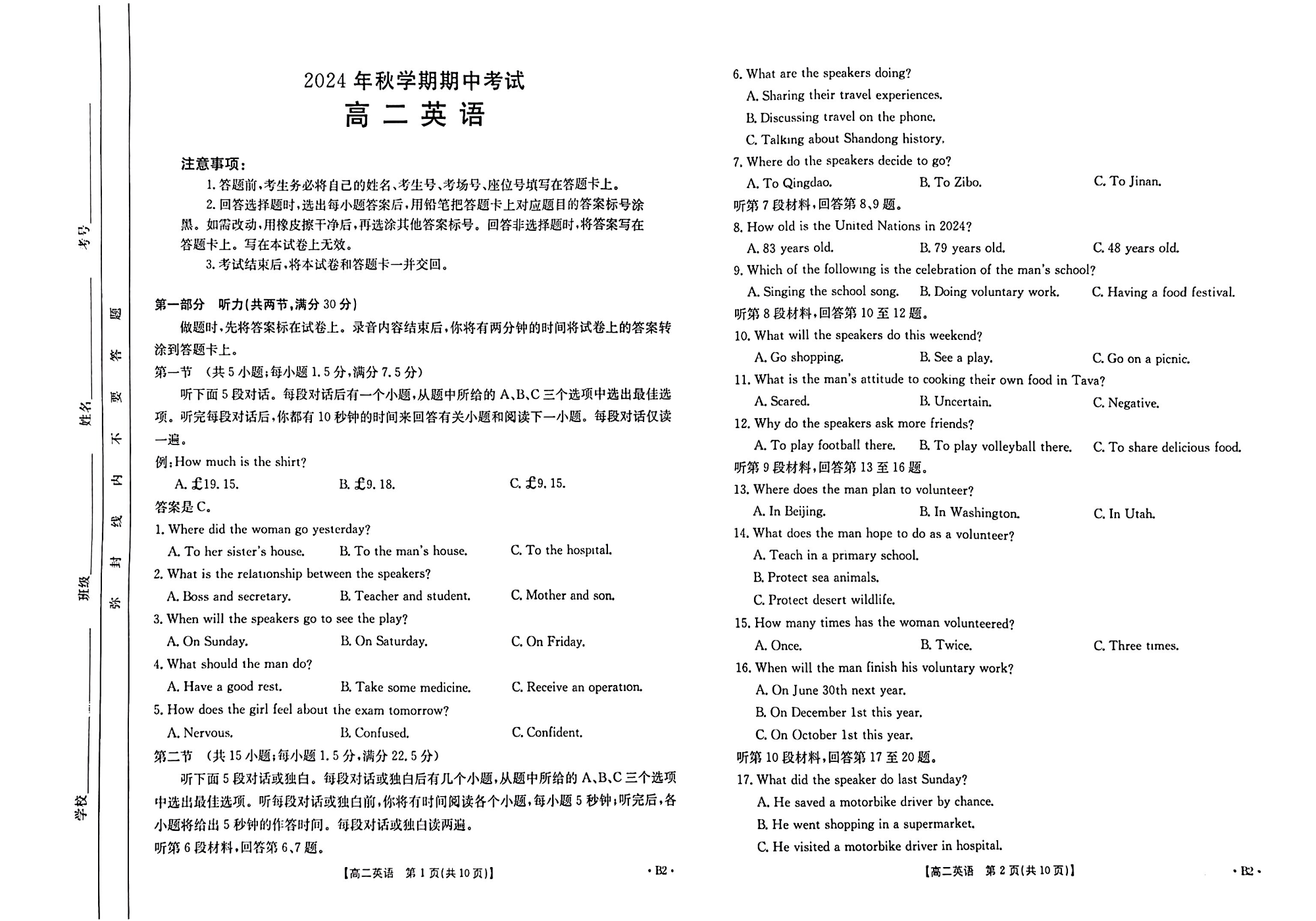 广西省梧州市2024年高二秋学期期中考试英语B2