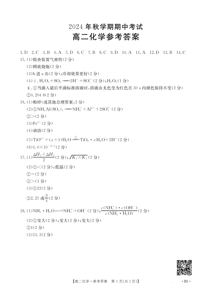广西省梧州市2024年高二秋学期期中考试化学B1答案