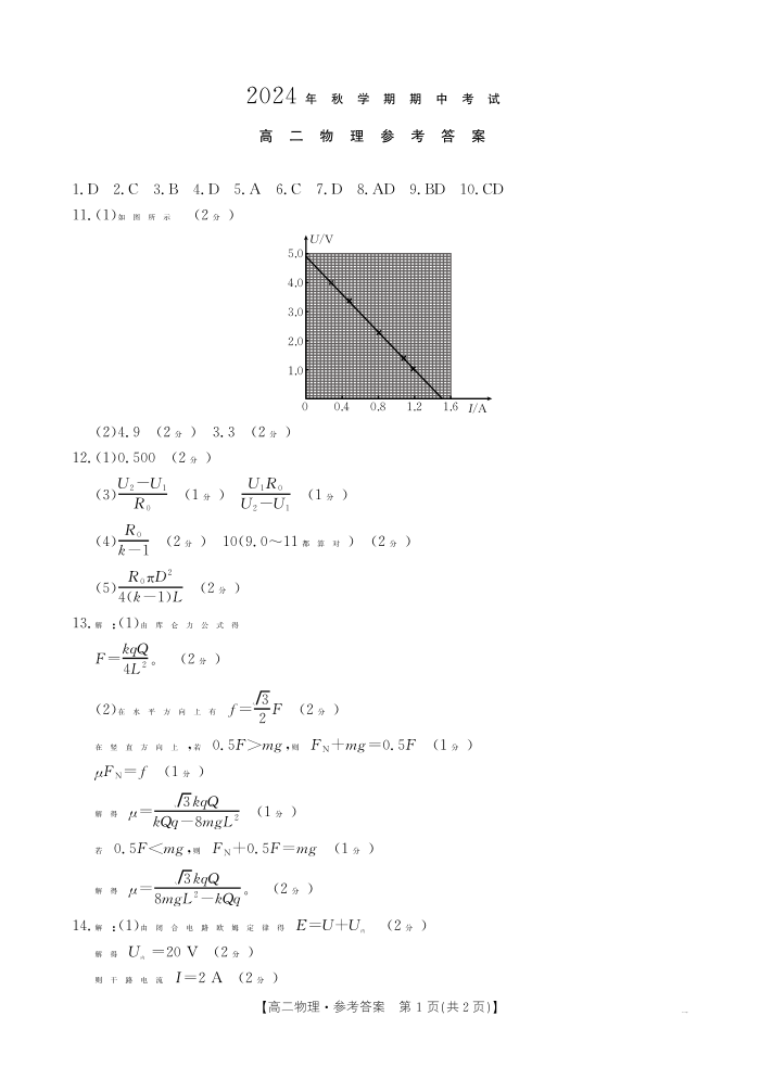 广西省梧州市2024年高二秋学期期中考试物理答案
