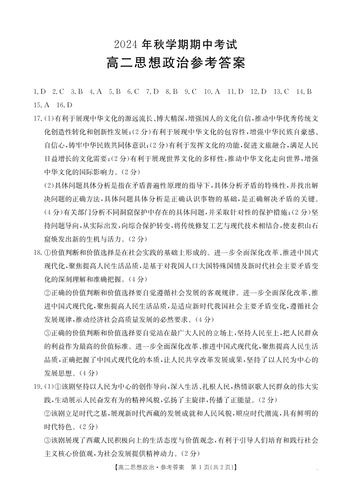 广西省梧州市2024年高二秋学期期中考试政治答案
