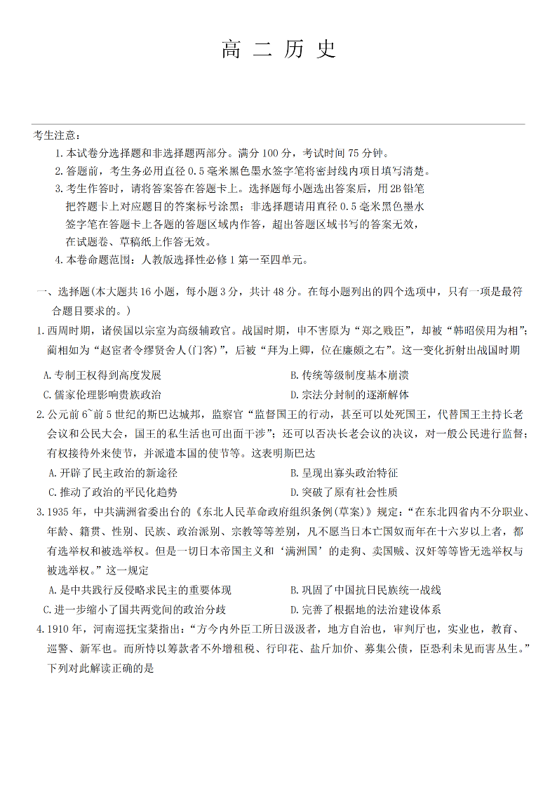 贵州省部分学校2024-2025学年高二上学期11月联考历史