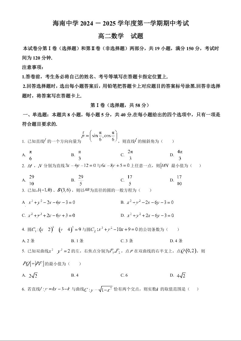 海南省海南中学2024-2025学年高二上学期11月期中考试数学+答案