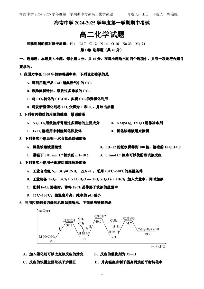 海南省海南中学2024-2025学年高二上学期11月期中考试化学+答案