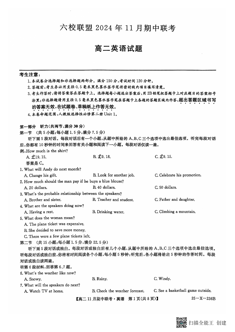 河北省保定市六校联盟2024年11月期中联考英语试题