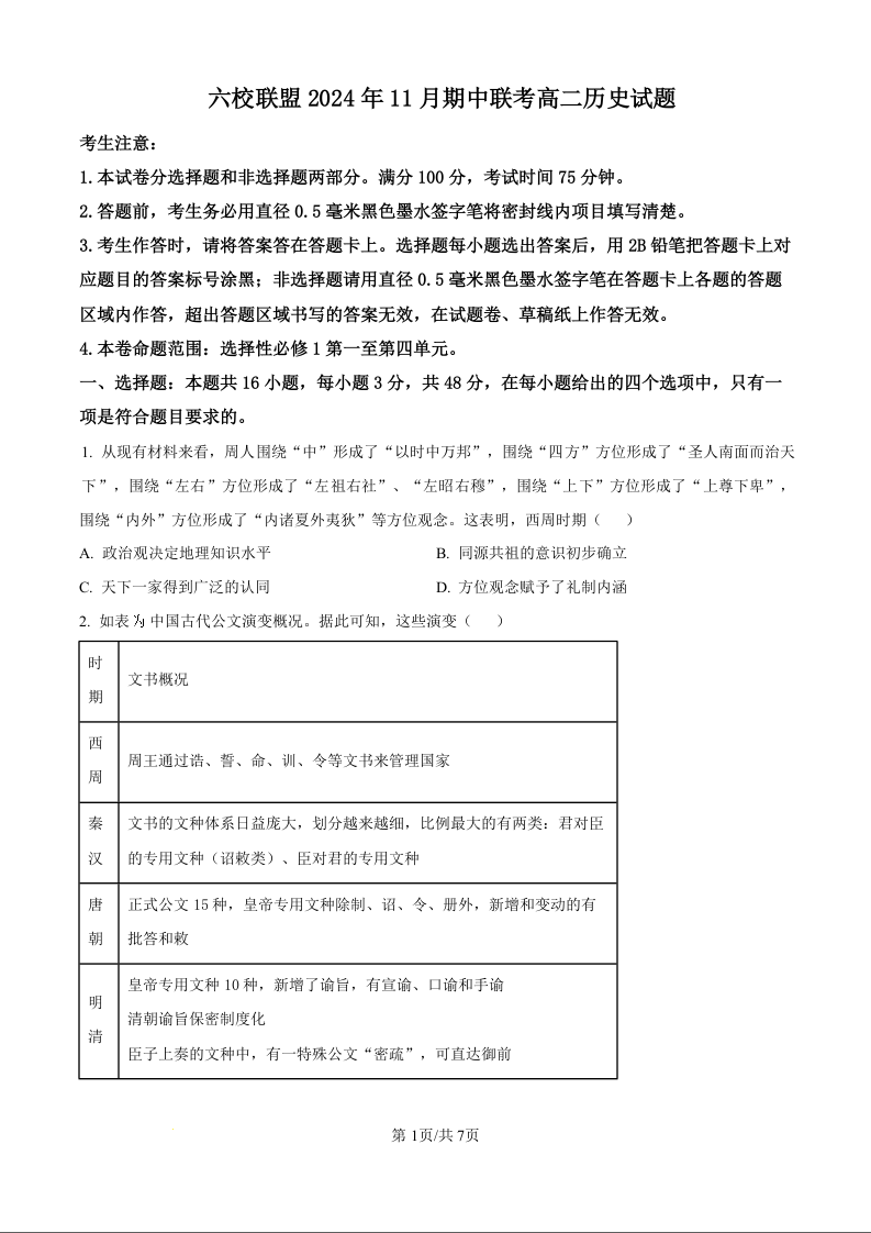 河北省保定市六校联盟2024年11月期中联考历史试题(原卷版)