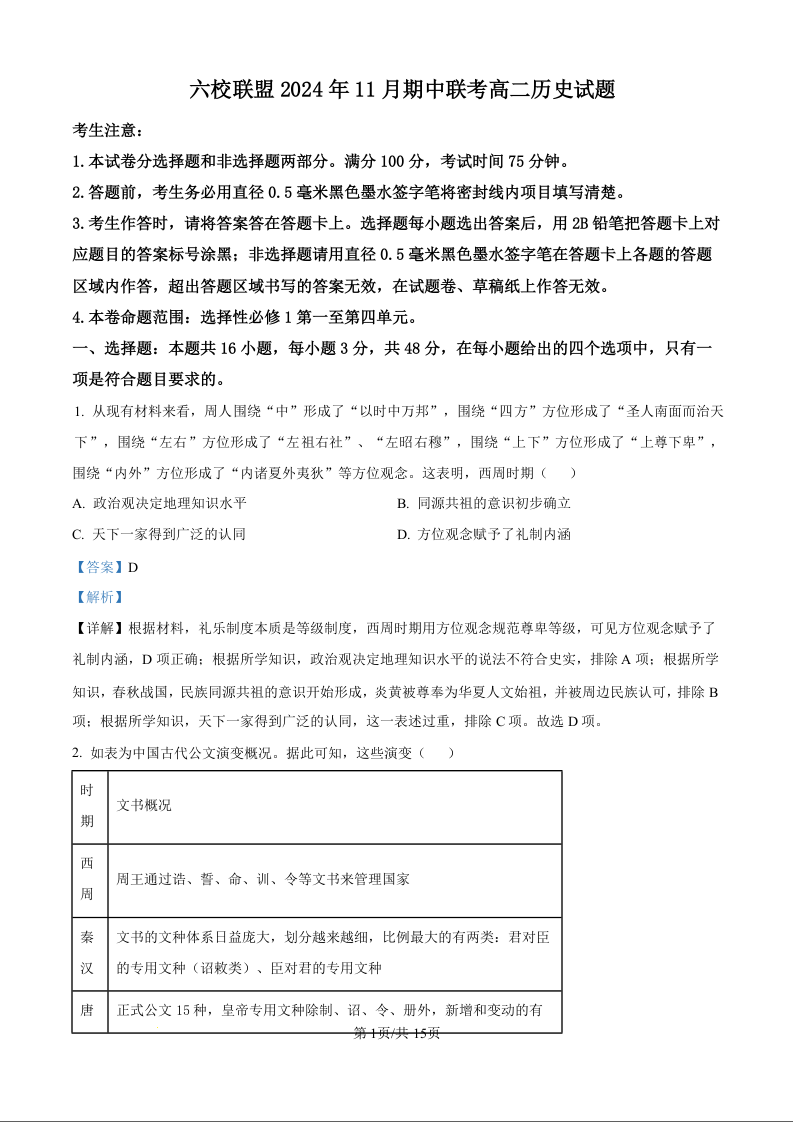 河北省保定市六校联盟2024年11月期中联考历史试题(解析版)