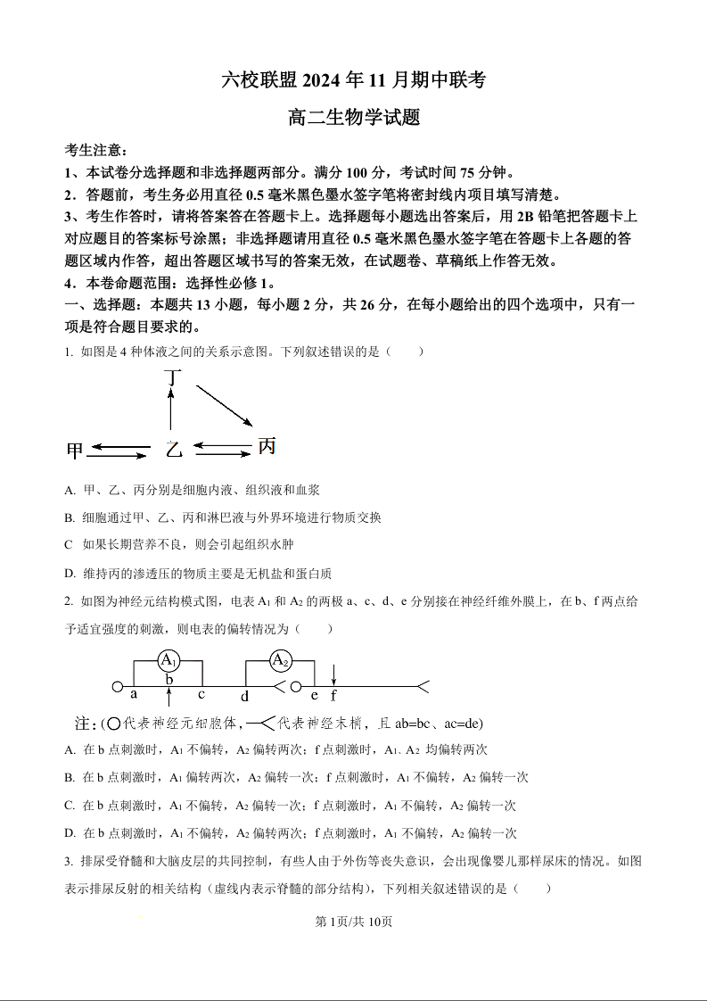 河北省保定市六校联盟2024年11月期中联考生物试题(原卷版)