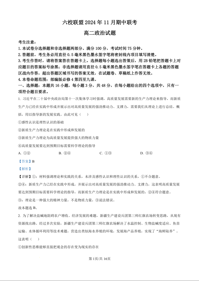 河北省保定市六校联盟2024年11月期中联考政治试题(解析版)