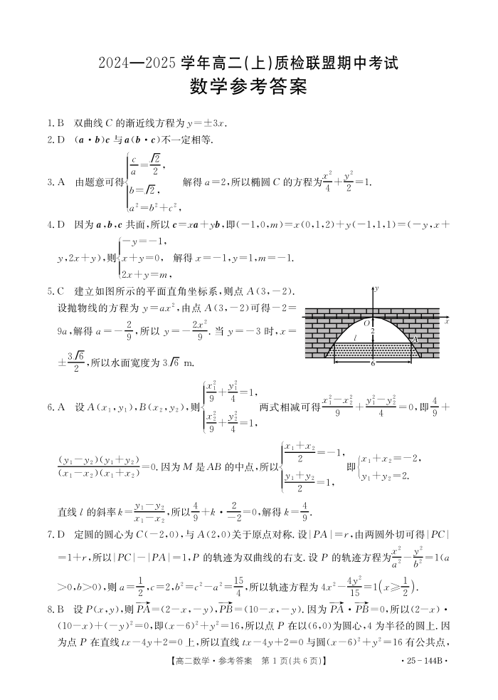 河北省邢台市2024-2025学年高二(上)质检联盟期中考试数学答案