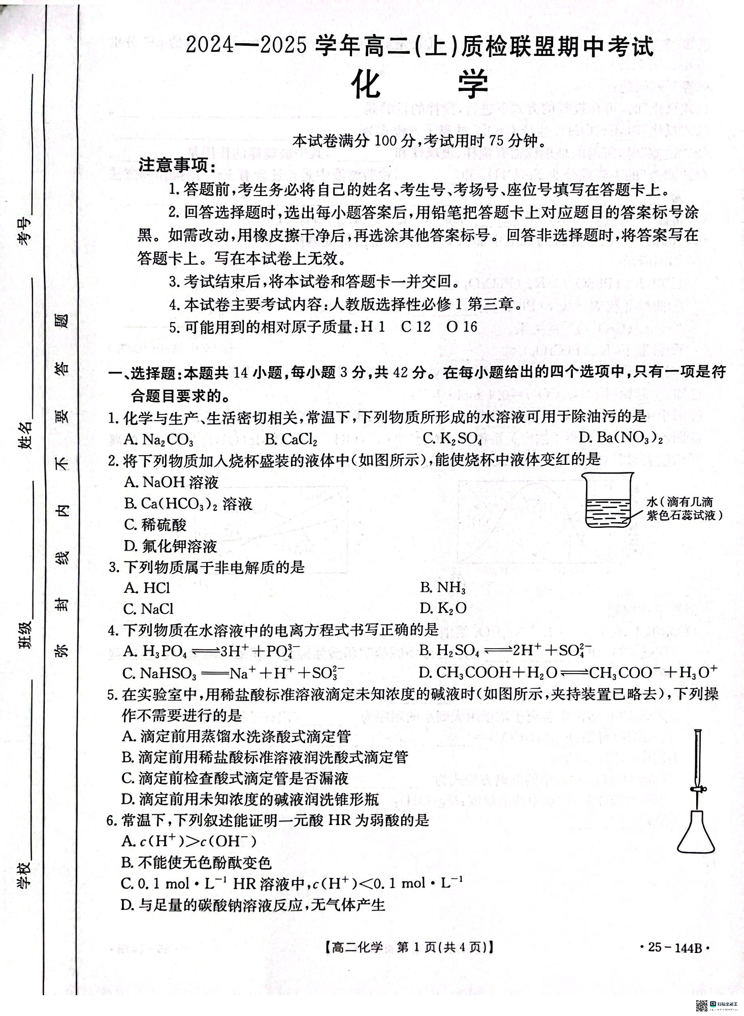 河北省邢台市2024-2025学年高二(上)质检联盟期中考试化学