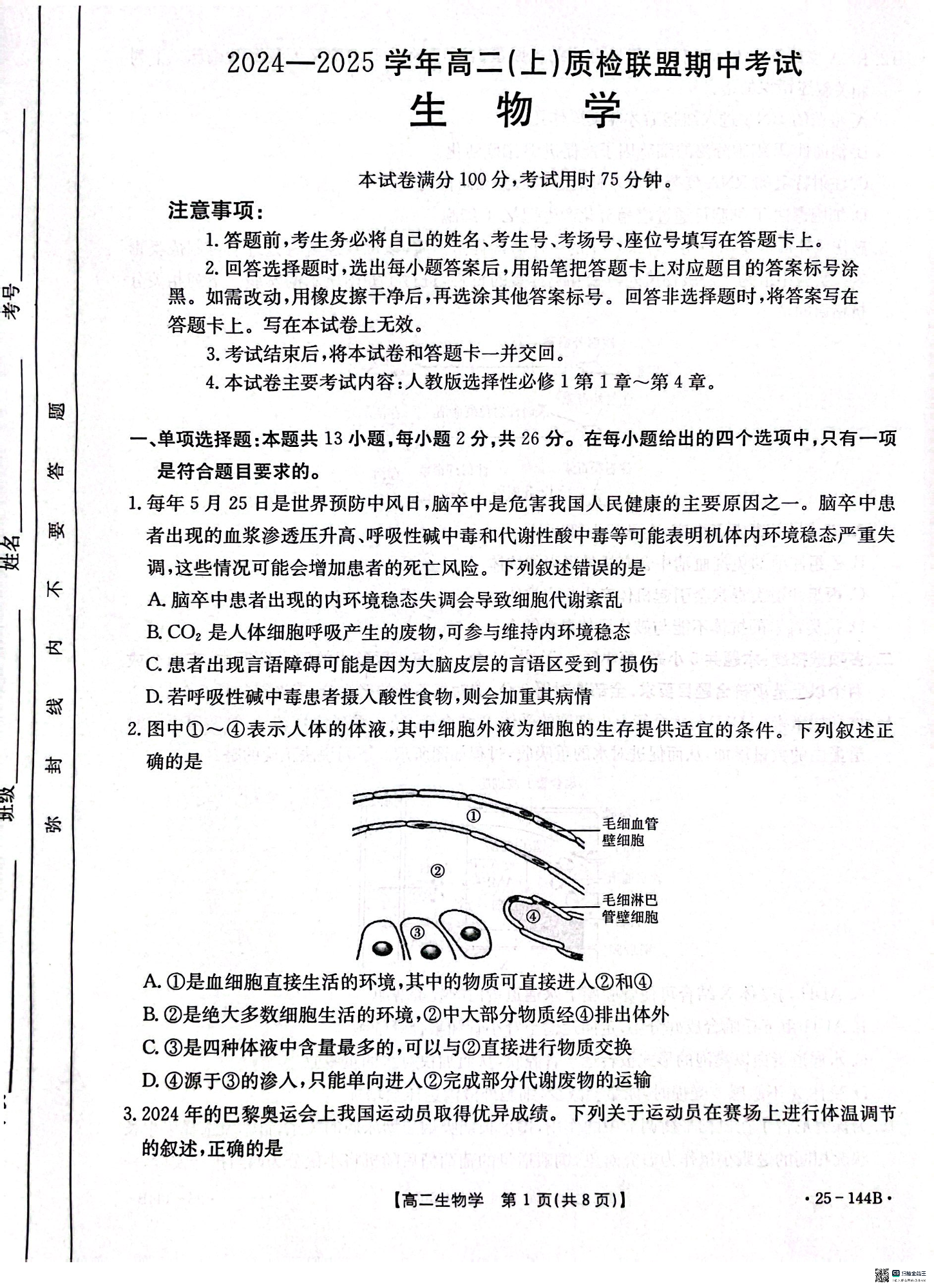 河北省邢台市2024-2025学年高二(上)质检联盟期中考试生物
