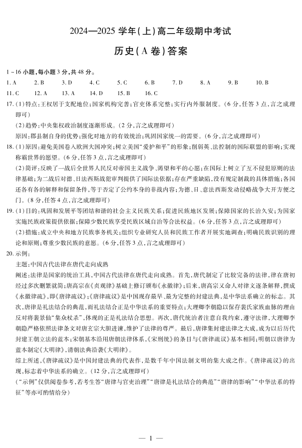 河南省2024-2025学年(上)高二年级期中考试历史答案