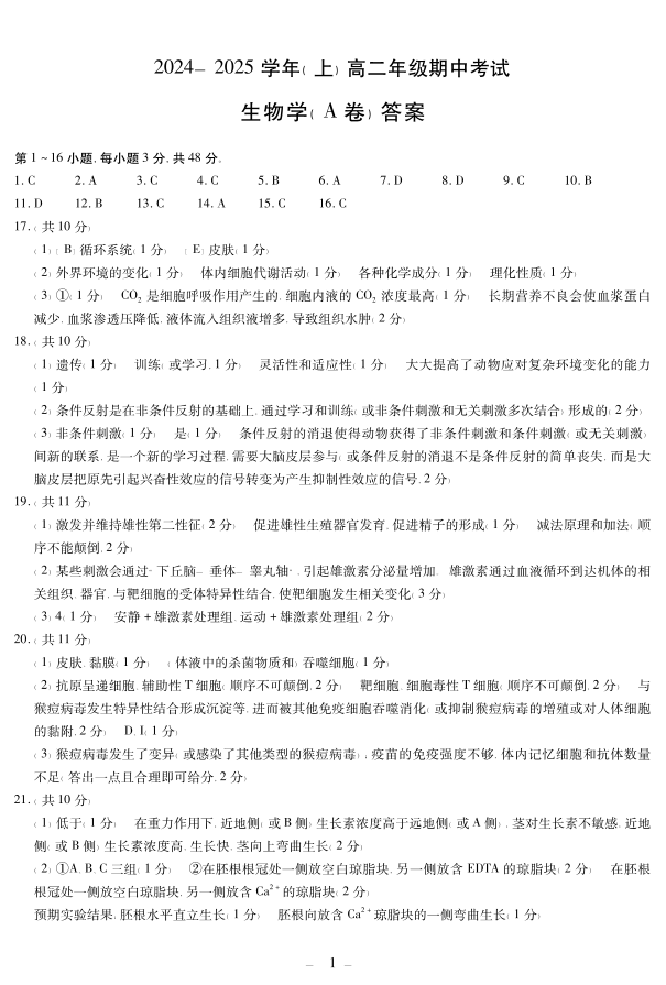 河南省2024-2025学年(上)高二年级期中考试生物答案