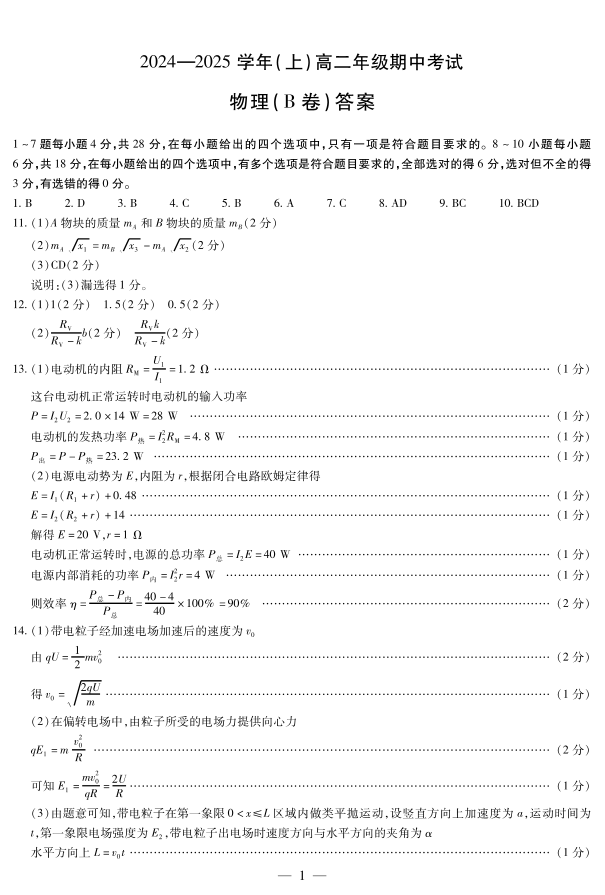 河南省2024-2025学年(上)高二年级期中考试物理答案