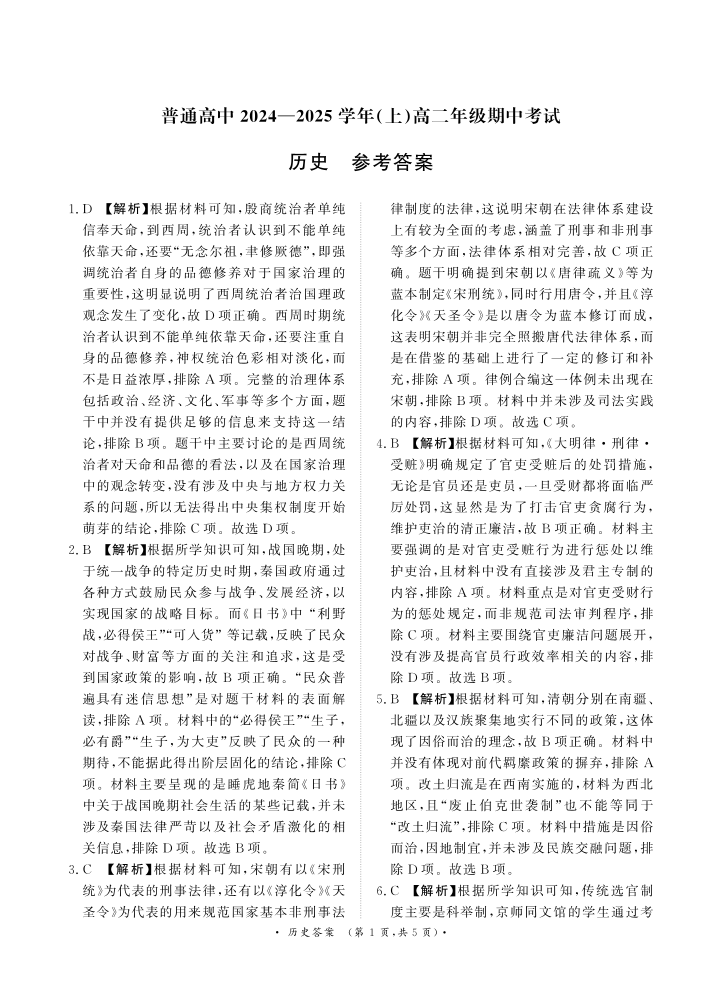 河南省普通高中2024-2025学年高二上学期期中考试历史答案