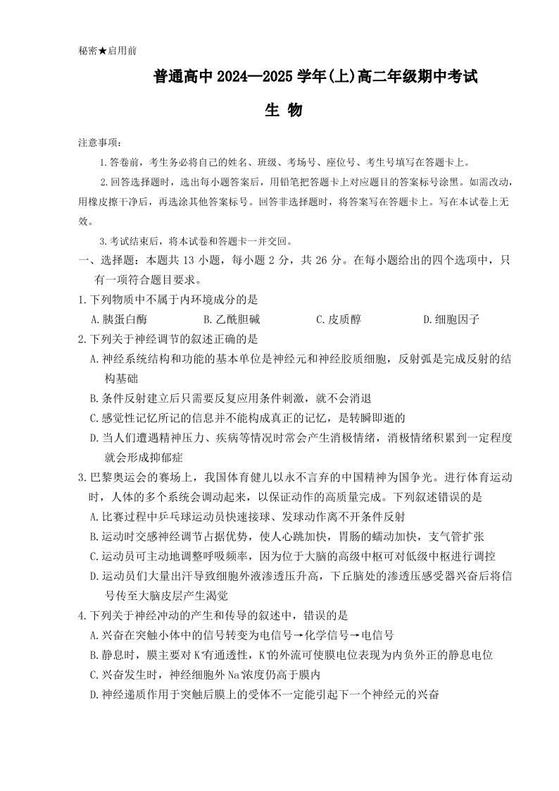 河南省普通高中2024-2025学年高二上学期期中考试生物