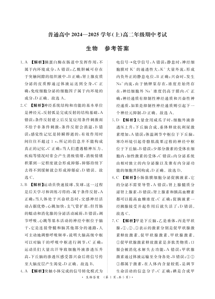 河南省普通高中2024-2025学年高二上学期期中考试生物答案