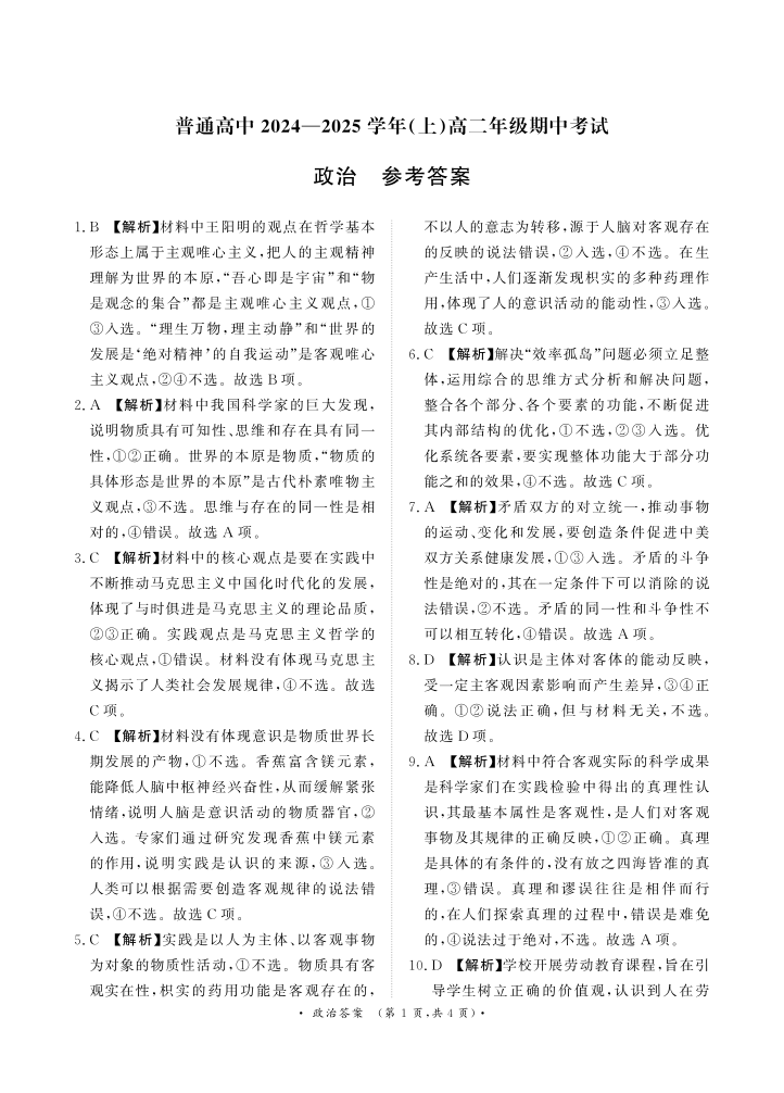 河南省普通高中2024-2025学年高二上学期期中考试政治答案