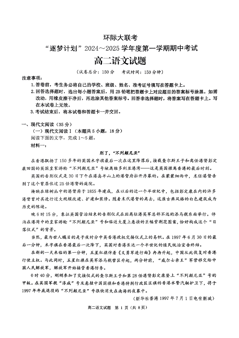 河南省驻马店市环际大联考“逐梦计划”2024-2025学年度第一学期期中考试语文试题