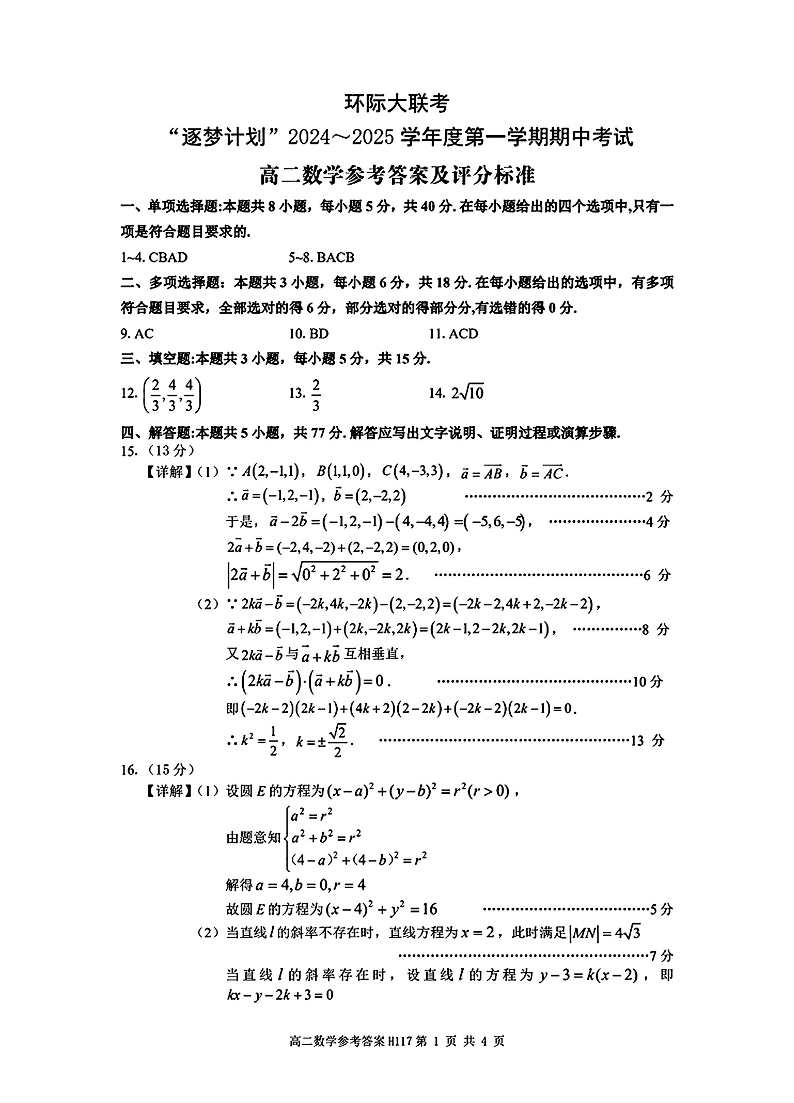 河南省驻马店市环际大联考“逐梦计划”2024-2025学年度第一学期期中考试数学参考答案