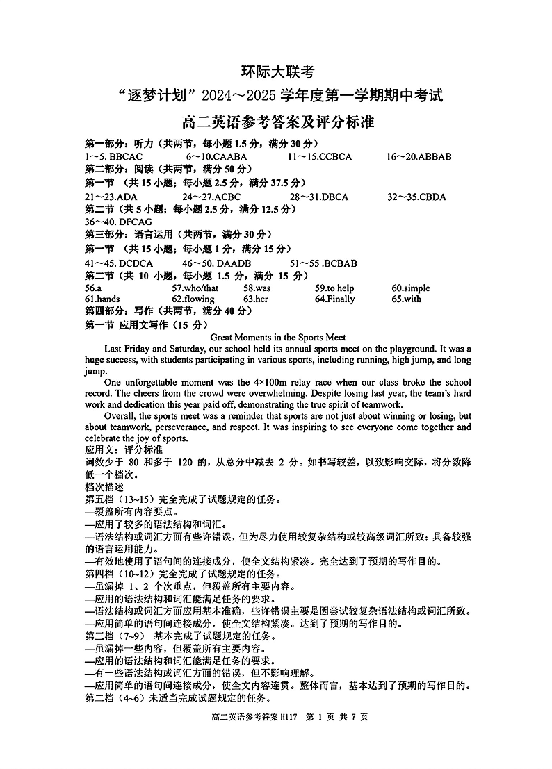 河南省驻马店市环际大联考“逐梦计划”2024-2025学年度第一学期期中考试英语参考答案