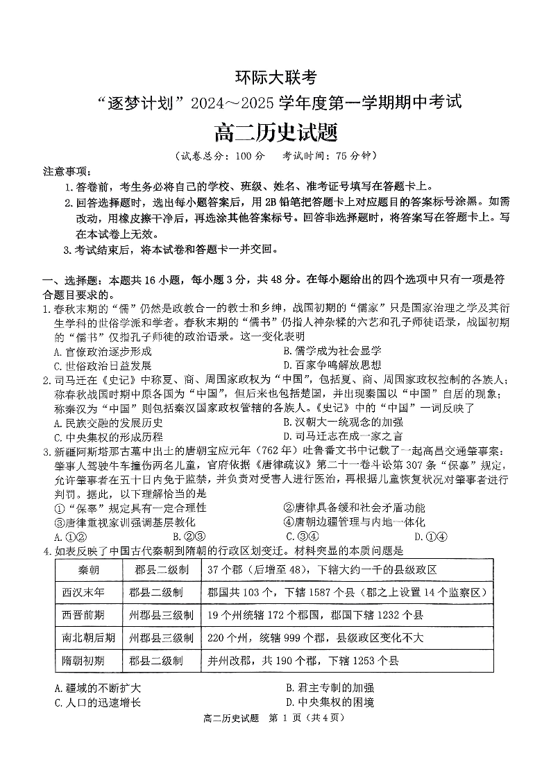 河南省驻马店市环际大联考“逐梦计划”2024-2025学年度第一学期期中考试历史试题