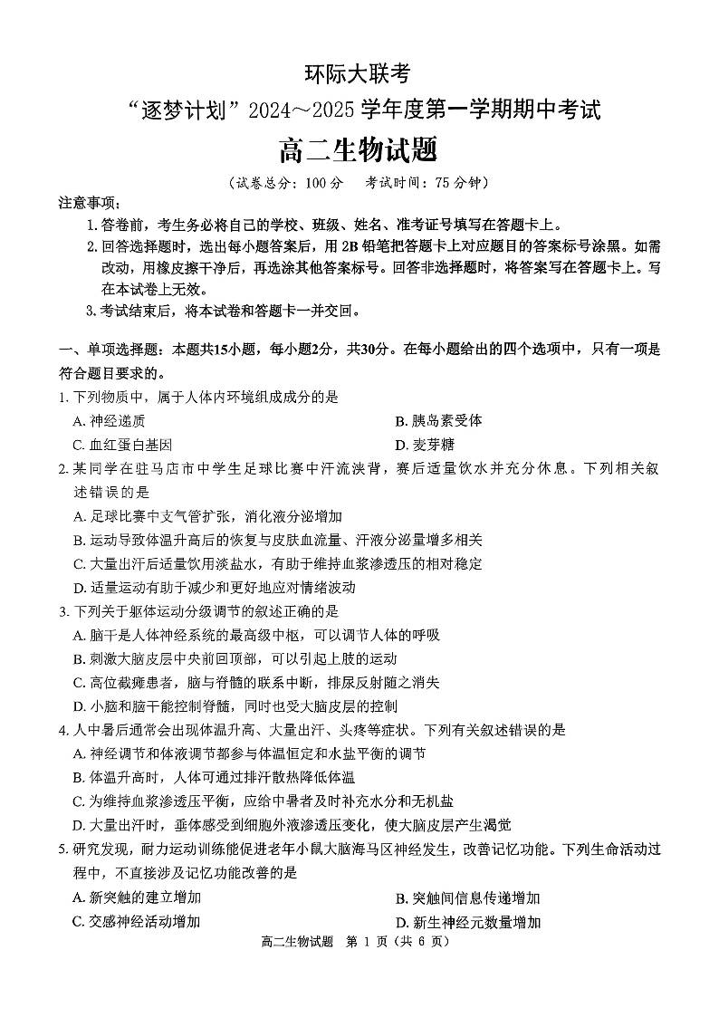 河南省驻马店市环际大联考“逐梦计划”2024-2025学年度第一学期期中考试生物试题