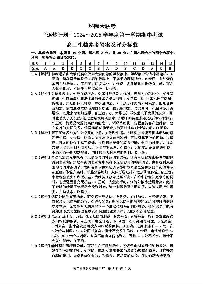 河南省驻马店市环际大联考“逐梦计划”2024-2025学年度第一学期期中考试生物参考答案