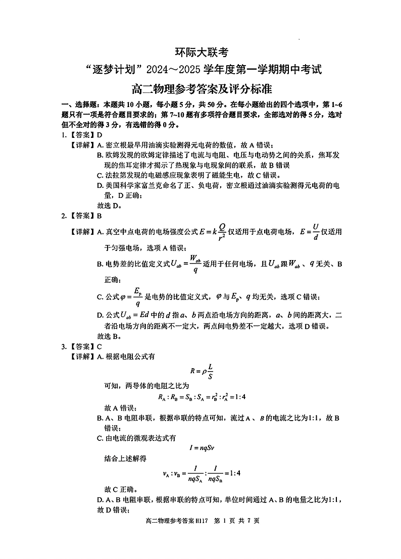 河南省驻马店市环际大联考“逐梦计划”2024-2025学年度第一学期期中考试物理参考答案