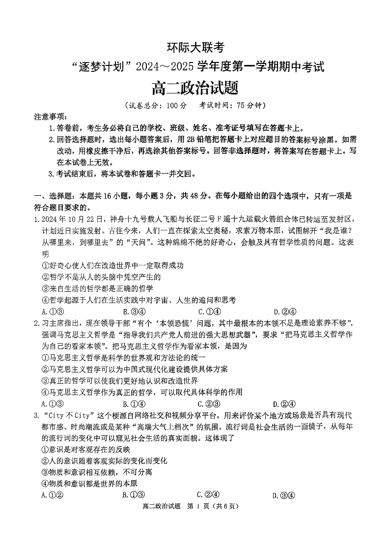 河南省驻马店市环际大联考“逐梦计划”2024-2025学年度第一学期期中考试政治试题