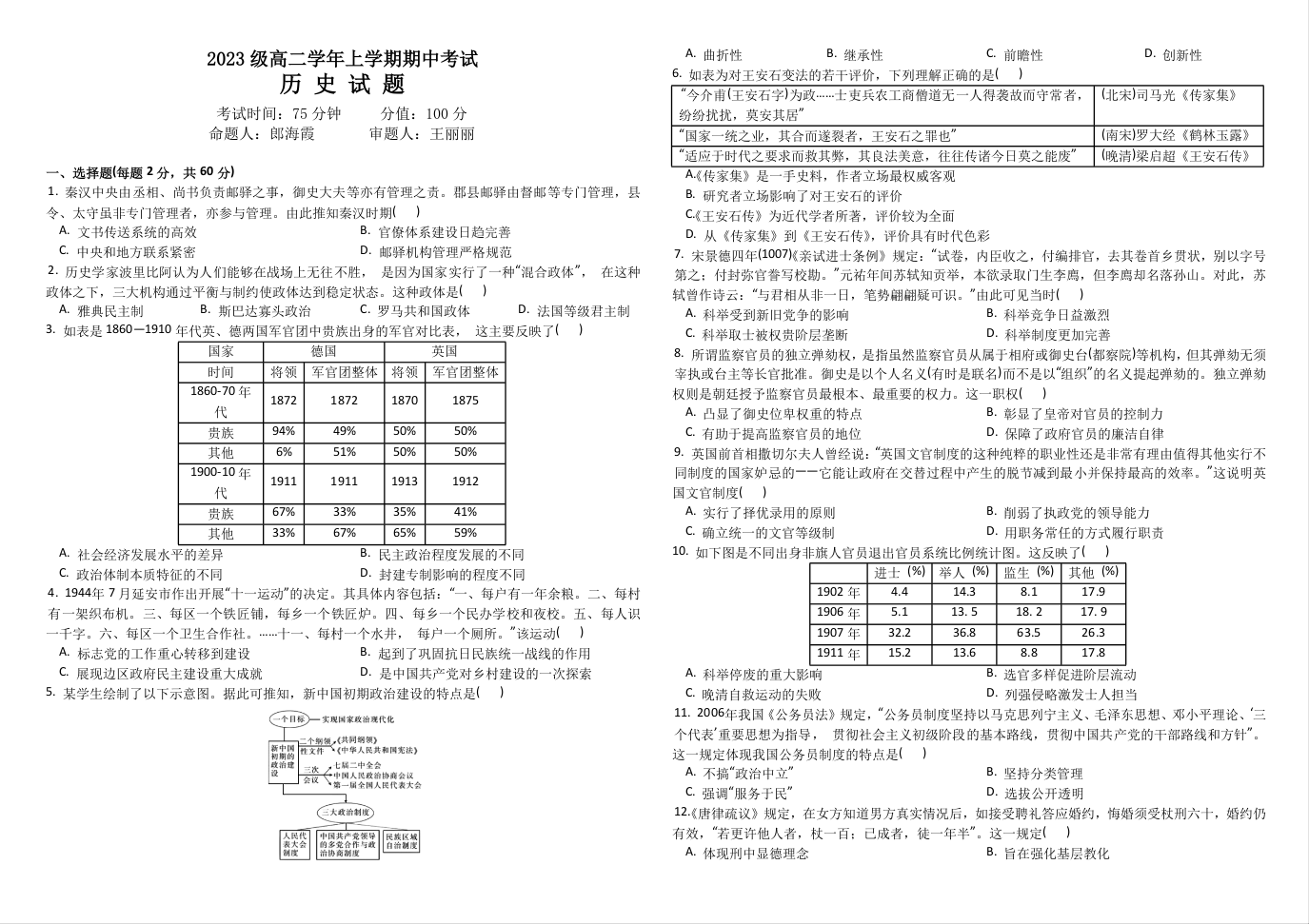 黑龙江省牡丹江市第一高级中学2023级高二上学期期中考试历史+答案