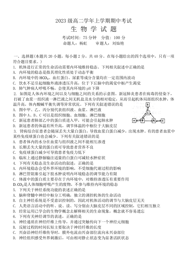 黑龙江省牡丹江市第一高级中学2023级高二上学期期中考试生物+答案