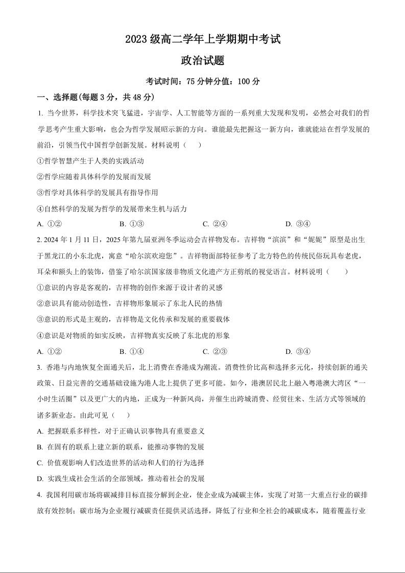 黑龙江省牡丹江市第一高级中学2023级高二上学期期中考试政治+答案