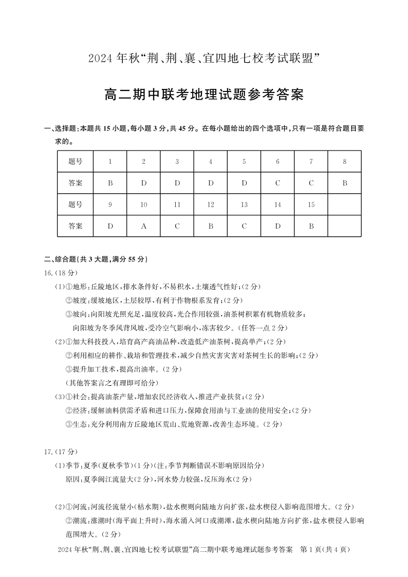湖北省2024年秋“荆、荆、襄、宜四地七校考试联盟”高二期中联考地理答案