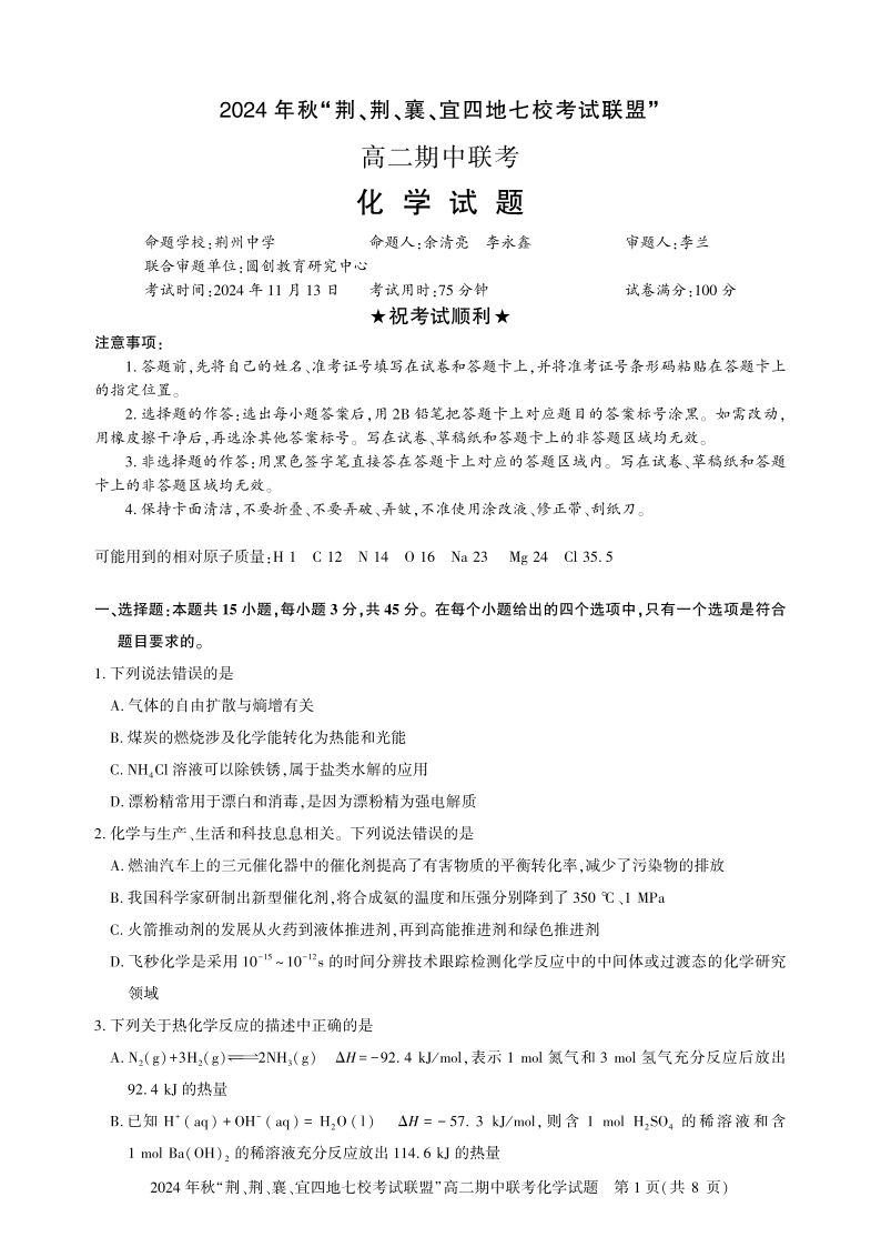 湖北省2024年秋“荆、荆、襄、宜四地七校考试联盟”高二期中联考化学