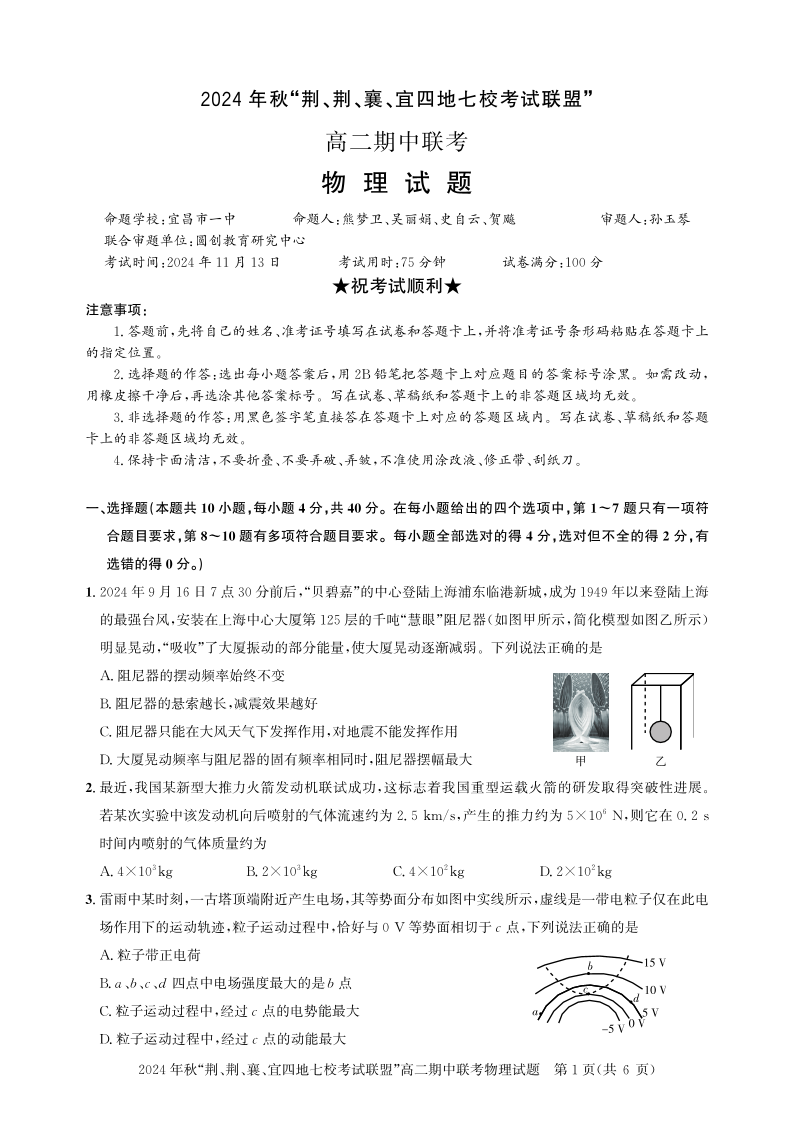 湖北省2024年秋“荆、荆、襄、宜四地七校考试联盟”高二期中联考物理