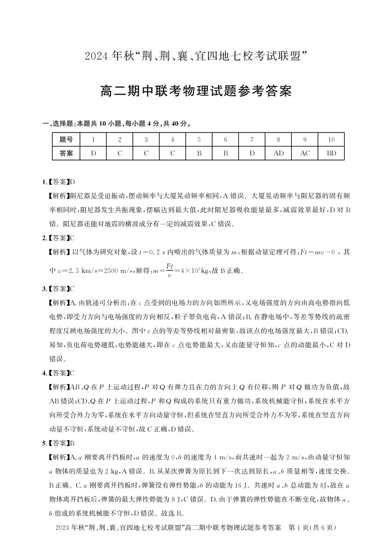 湖北省2024年秋“荆、荆、襄、宜四地七校考试联盟”高二期中联考物理答案