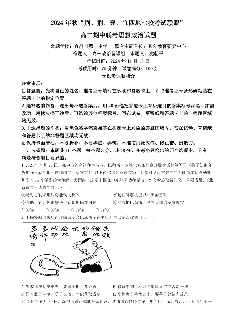 湖北省2024年秋“荆、荆、襄、宜四地七校考试联盟”高二期中联考政治+答案